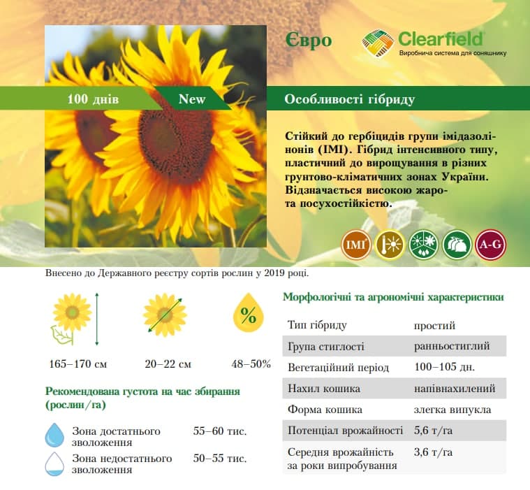 ОСНОВНІ ХАРАКТЕРИСТИКИ ГІБРИДУ СОНЯШНИКА ЄВРО:
