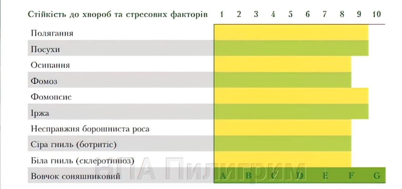 | Додатково | висока врожайність|високоолійність|стійкість до вовчка|стійкий до гербіцидів групи імідазолінонів|стійкість до основних хвороб|стійкість до вилягання |
